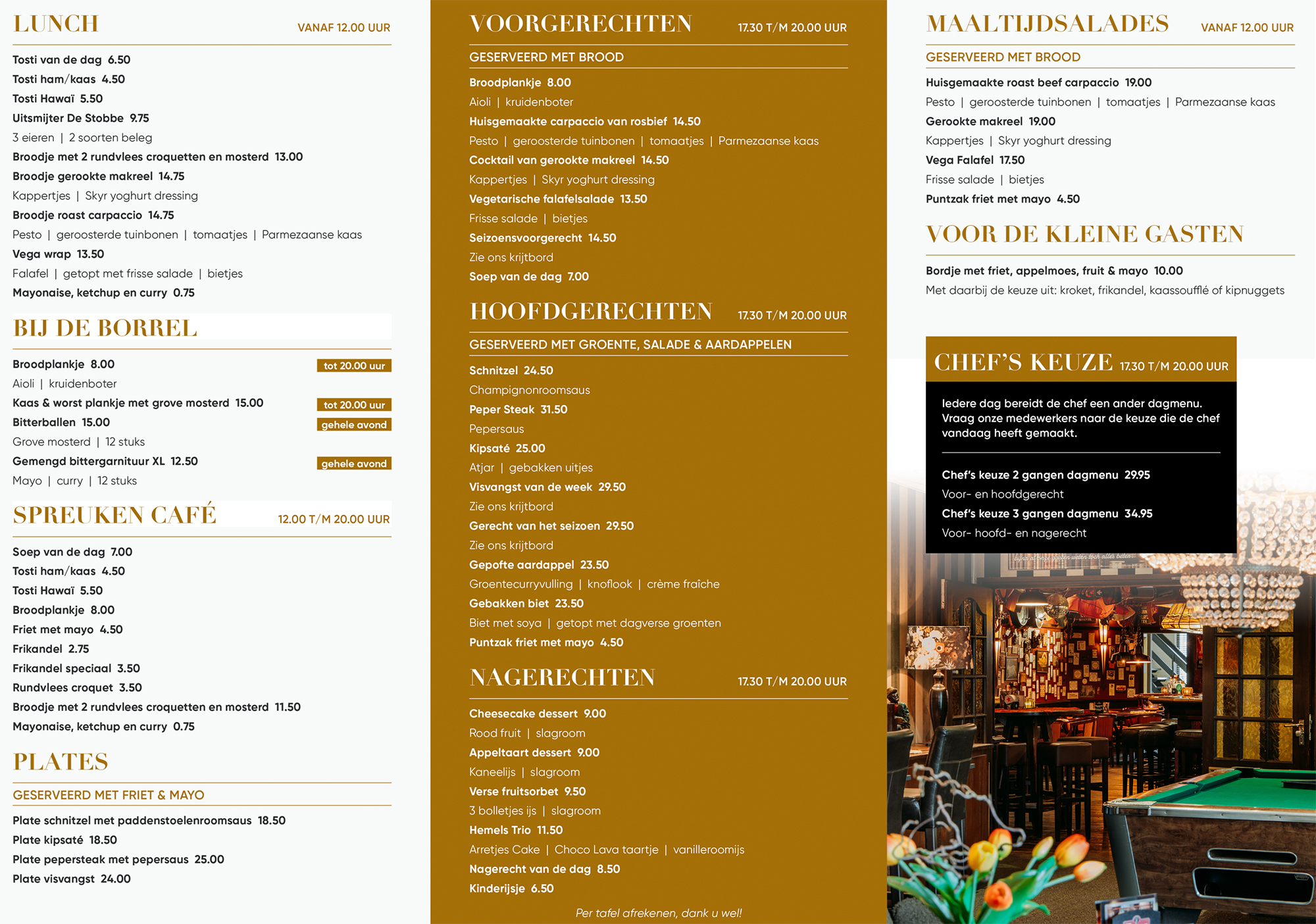 In de middag een verse lunch of s'avonds een wisselend 3 gangen dagmenu vol lekkers die je eigenlijk altijd wel wilt.