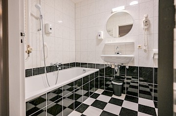 Een badkamer met ligbad en douche, een zithoek én een eigen terras of balkon.